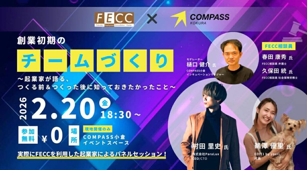 ● COMPASS小倉と共催でイベントを開催します● 創業初期のスタートアップにとって「誰と、どんなチームをつくるか」は、事業の行方を左右する重要なテーマです。 本イベントでは、実際に起業家としてチーム作りを経験してきた […]