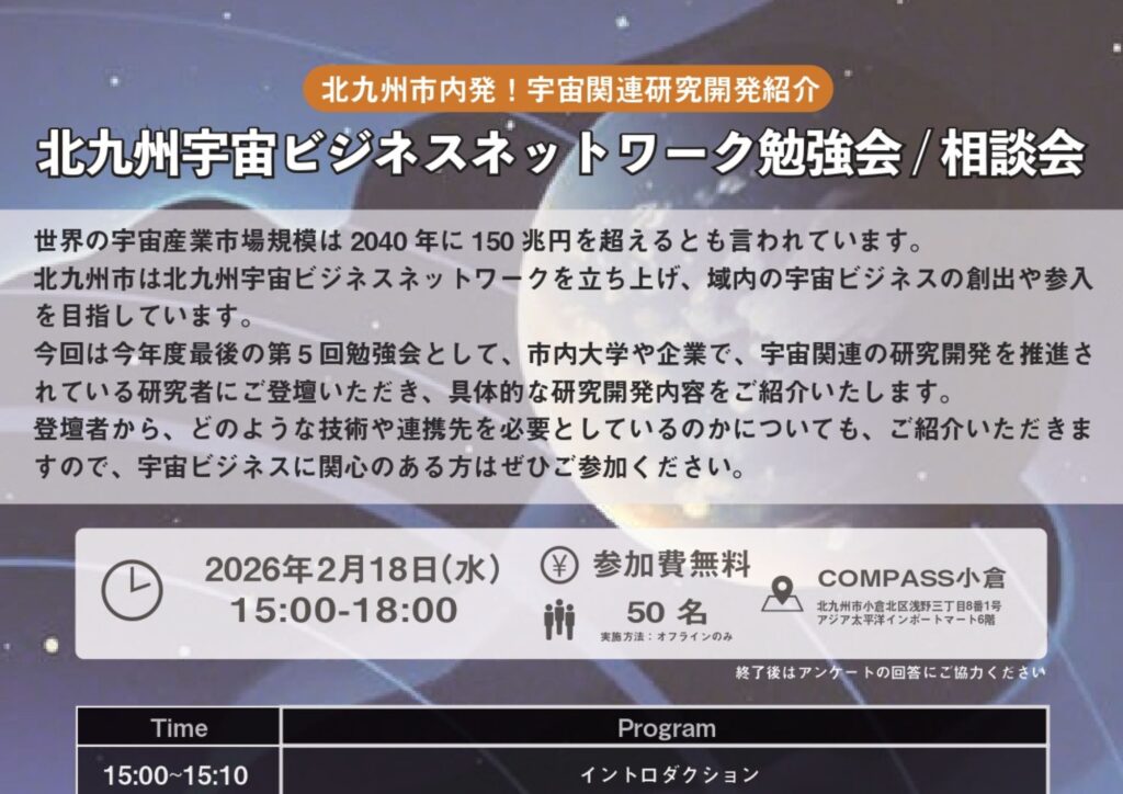 世界の宇宙産業市場規模は2040年に150兆円を超えるとも言われています。 北九州市は昨年、北九州宇宙ビジネスネットワークを立ち上げ、域内の宇宙ビジネスの創出や参入を目指しています。 今年度は宇宙ビジネスの最前線で活躍す […]
