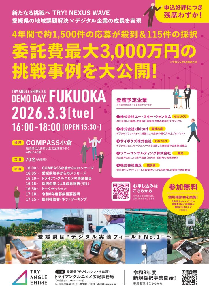 3月3日、COMPASS小倉にて「トライアングルエヒメ デモデイ福岡」を開催します! DXや新規事業のリアルな事例が聞けるチャンスです。ご興味のある方はぜひお気軽にご参加ください! 【新たなる挑戦へ TRY! NEXUS […]