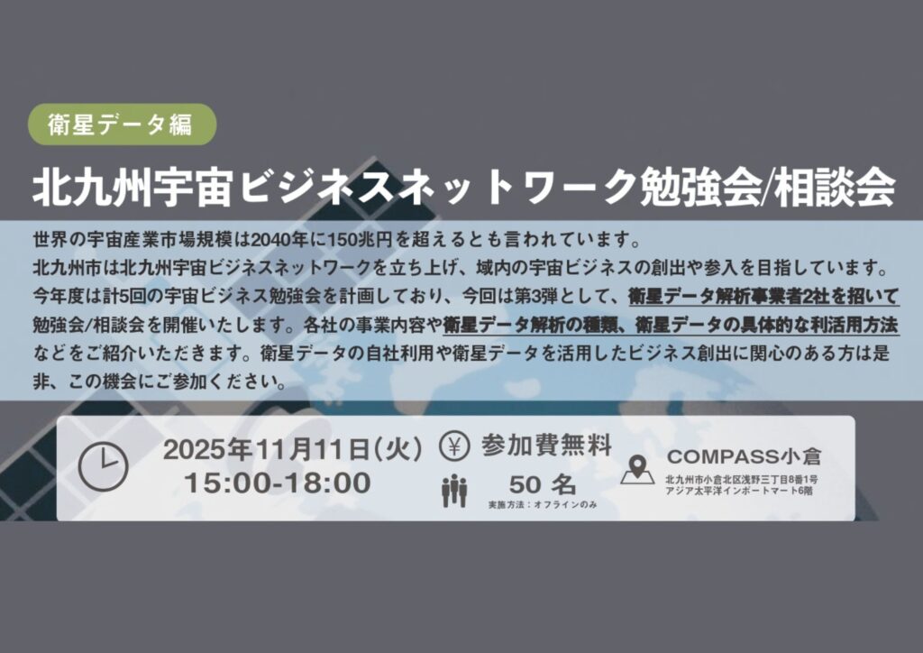 《11月11日開催!》(衛星データ編)北九州宇宙ビジネスネットワーク 勉強会開催のお知らせ 世界の宇宙産業市場規模は2040年に150兆円を超えるとも言われています。 北九州市は北九州宇宙ビジネスネットワークを立ち上げ、域内の宇宙ビジネスの創出や参入を目指しています。 今年度は計5回の宇宙ビジネスネットワーク勉強会を予定しており、今回は第3弾として、衛星データ解析事業者2社を招いて勉強会/相…